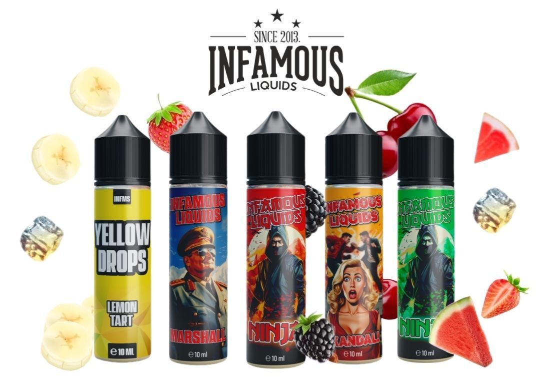 Séria INFAMOUS Specials prináša originálne a premyslené kombinácie chutí, ktoré posúvajú klasické arómy na novú úroveň. Ide o Shake & Vape príchute (10 ml v 60 ml fľaši), ktoré si jednoducho doplníš podľa vlastných preferencií a vytvoríš si ideálny e-liquid.